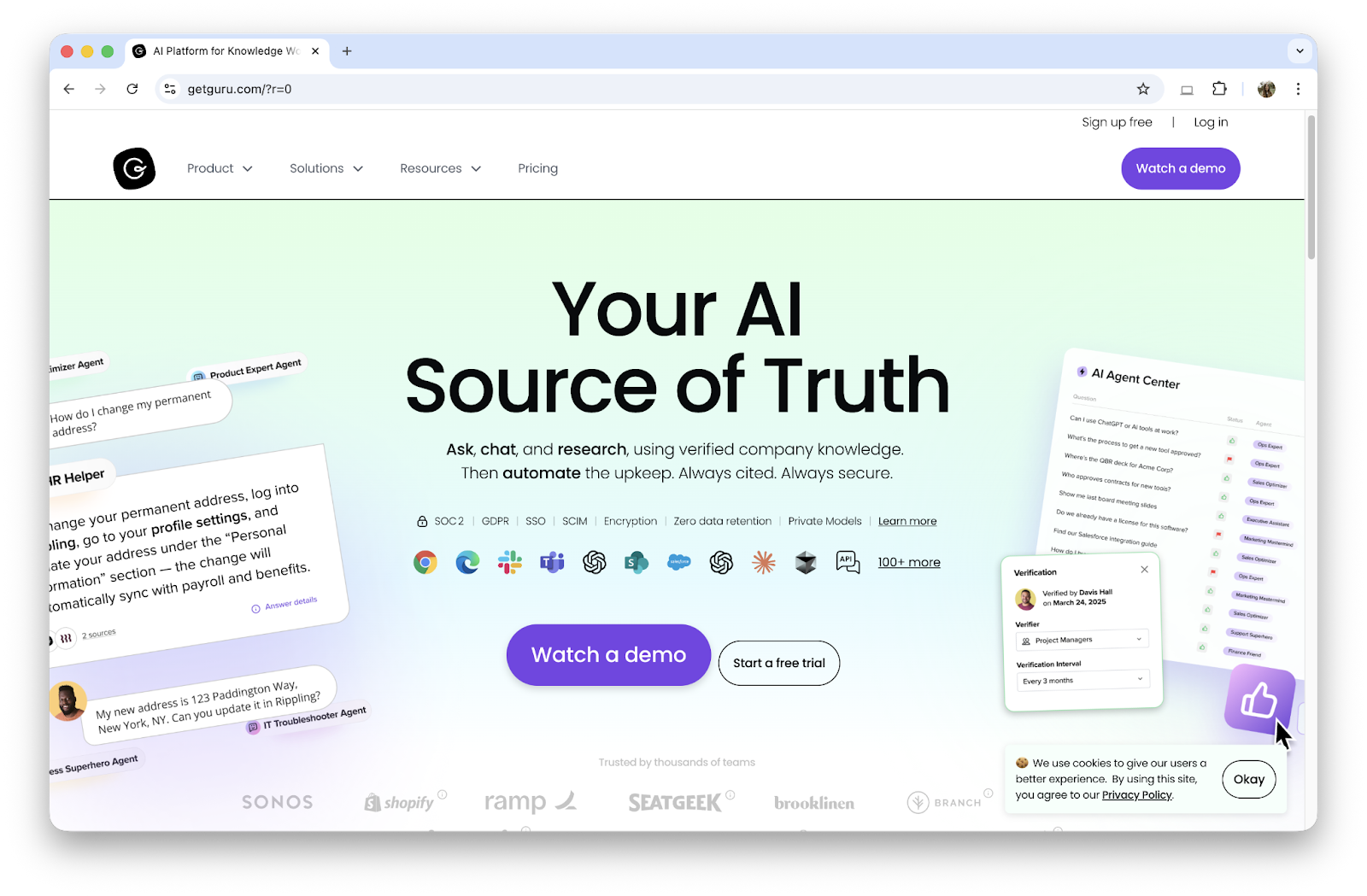 Guru is an AI platform that centralizes company knowledge to give employees verified answers. They constantly make updates to their site, and the Webflow and Crowdin integration helps them scale quickly and seamlessly.